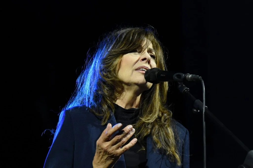 È meravigliosa nella sua essenzialità, la lunga chioma di capelli, lo sguardo profondo e il grande sorriso, la linearità del suo tailleur blu scuro. Allarga le braccia per accogliere tutto il suo pubblico e inizia a cantare.